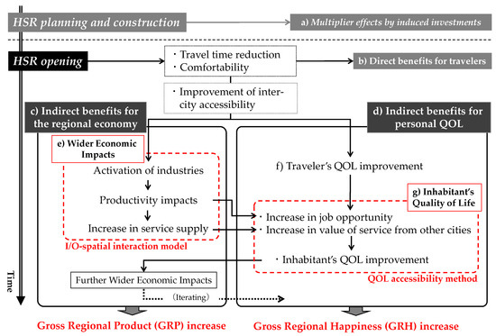 Indirect benefits for the regional economy include the stimulation of business-to-business communication and industry interaction, and medium- to long-term benefits, which are a part of the so-called (e) wider economic impacts [9], including productivity impacts and an increase in service supply. Indirect benefits for personal QOL include (f) the traveler’s QOL improvement in the short term, the subsequent increase in job opportunities, and the value of service from other cities, along with wider economic impacts, which will also (g) improve the QOL of inhabitant along the HSR corridor who do not use the HSR. This means that these effects are mutually enhanced, which is the main point of this study.