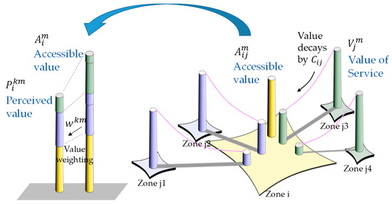 where is the perceived value of service m for person k in zone i, and is the weight of the value of service m for person k. The concepts of Equations (6) and (7) are schematically illustrated in Figure 3. The figure shows that a person living in zone i can obtain the accessible value from various services in the surrounding zone j, which decays by spatial impedance and obtains the perceived value through the personal weight of the value.