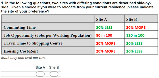 The survey items mainly consisted of individuals’ attributes, current values regarding QOL indicators, pairwise comparisons regarding QOL indicators, and pairwise comparisons regarding QOT indicators. An example of pairwise comparisons for QOL indicators is shown in Figure 4. Specifically, the questions were structured so that the respondents chose the preferred one from two sites with different combinations of multiple indicator conditions. Since the conditions for the living environment are expected to differ depending on the current residential site, the questions were set to ask about the percentage (%) change from the current environment. Similarly, in the case of QOT, the questions were structured so that the respondents chose the preferred one from two transportation options with different conditions.