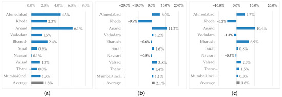 Comparing the results, it was found that the distribution trends of the increase in personal QOL were different in each zone, due to the different changes in the accessibility of each zone after the opening of the MAHSR, depending on the location of various facilities. Specifically, Figure 6a shows that the improvement in personal QOL by job opportunity increase is the greatest in the vicinity of the large city (Ahmedabad). This indicates that the mutual enhancement—as the industrial development associated with the HSR leads to a higher income and, in turn, personal QOL improvement—is remarkable in these cities. On the other hand, Figure 6b–d shows that, when various QOL factors are taken into account, personal QOL tends to show greater effects in the middle cities rather than in the two metropolitan areas of Mumbai and Ahmedabad, where various types of facilities are originally accessible within each area. This suggests that the MAHSR will bring broad spillover QOL impacts throughout the corridor region, where accessibility to metropolitan areas is newly improved. As described above, it is now possible to represent the geographical distribution of various QOL impacts, which vary according to the type of value perceived by the individuals.
