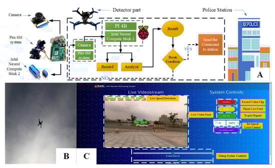 Proposed speed detection system (A) the total system scheme and logic, (B) the proposed UAV, (C) the system performance and designed GUI.