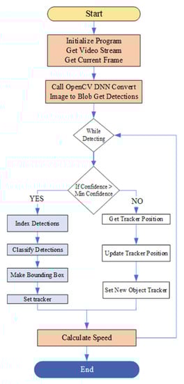 The proposed system follows the described process in Figure 3. As shown, the main steps of work consist of initialization, which includes initializing the camera for live stream, DNN (SSD-mobile net) calling to perform in the vehicle’s detection section, and speed calculation.