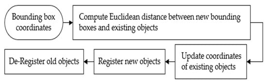 where Band is band values, and μBAND is the mean of each red, green, and blue Band, respectively, σ is the scaling factor for normalization. After normalization, Mobile Net-SSD is used for detecting vehicles. Mobile Net-SSD is a Single-Shot multi-box Detection (SSD) network intended to perform object detection. The vehicle detection and tracking system loops over all detected vehicles, add a bounding box around them and then calculates the centroid of the boxes. After the bounding box coordinates are extracted, the Euclidean distances between the new and old bounding boxes are calculated. Each video frame can have a different position of the previously tracked object, leading to different boxes assigned to the same object in different frames. To avoid this, the distance between the new object in the next frame and the old object in the last frame is calculated using the following equation (Equation (2)):