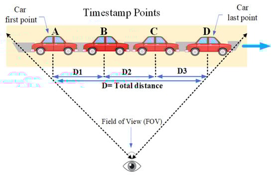 where D1 is the distance between points A–B in meters at t1 second, the distance D2 between points B–C as t2 second, and the points C–D distance as D3 meter with t3 second. As Figure 5 shows, tracking an object in four points results in three distances included in the relationship to calculate the average. In the next step, the system calculates the field of view (FOV) based on the distance from the object. From the system point of view, at the same time, new vehicles are constantly being tracked and registered, and old objects are being deregistered. Meanwhile, the improved VASCAR algorithm is applied to each tracked vehicle. In the second phase, the system initializes the estimated speed list, loops over all the pairs of points, and estimates the speed of each object. Then, it calculates the number of pixels between centroids in points and converts it to real-world distance(meters) as the pixel per meter (PPM) in Equation (5) and calculates the vehicle’s average speed.