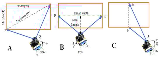 As shown in Figure 6, to extract the maximum Pi camera FOV, the camera has been moved on along with points P and Q. Then, using Equation (9), the camera horizontal FOV value can be defined by: