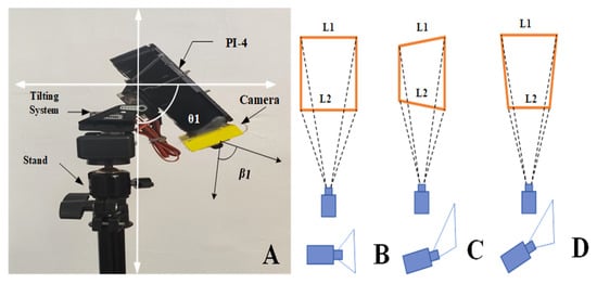 As Figure 6A shows, the camera system was put on top of the tilt systems to move the camera on various x- and y-axes. It should be mentioned that for each tilt, the trapezoidal area of the image gets changed (Figure 6B,C) [32]. Then, to calculate the FOV, the median of the trapezoidal (MT) image area is recalculated using the Equation (10).