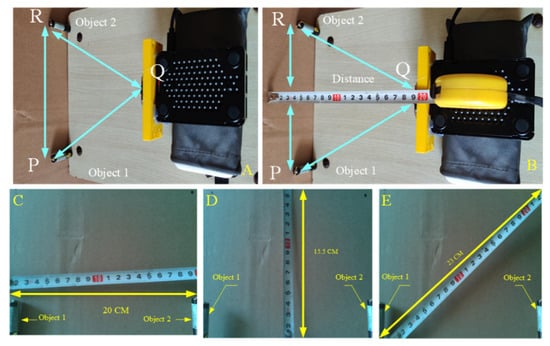 Indoor setup for horizontal, vertical, and diagonal FOV extraction from a fixed distance. (A): Distance between fixed object and camera, (B): Real Horizontal Length measurement, (C): Horizontal lengths inside the obtained image, (D): vertical lengths inside the obtained image, (E): diagonal lengths inside the obtained image.
