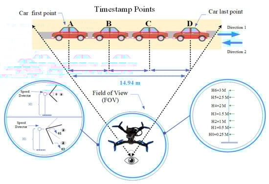 - A low-altitude drone equipped with a Mobile Net-SSD method to measure vehicle speed and a network connection capability was employed to implement our approach.