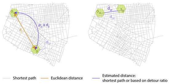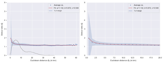 We adapt the concept of detour ratio, first introduced by [18] to nominate the ratio of the trip length d with a baseline distance , e.g., the Euclidean distance [3,18] or the shortest path distance [3]. This concept characterises the extra amount of distance travelled compared to the baseline distance. We adjust this notion by defining a detour ratio as the ratio of the shortest path distance with the Euclidean :