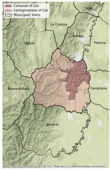 - Armitage Cadavid, M.; Londoño Gomez, E.; Cancelado Sanchez, U.D.; Escobar Morales, G.; Perilla Galvis, D.M. Cali en cifras 2018–2019; Technical Report; Departamento Administrativo de Planeacion, Alcadia de Santiago de Cali: Santiago de Cali, Colombia, 2019.
