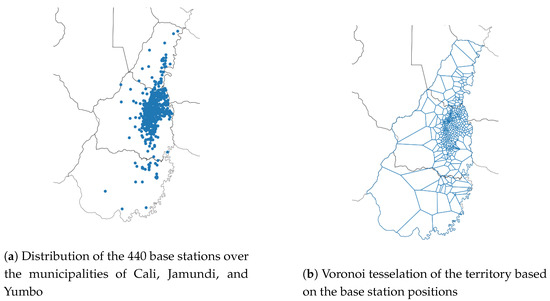 A total number of 440 base stations are covering Cali, Yumbo, and Jamundi with an uneven density. The base station network is denser in the city centre than in the city surroundings, where approximately 70% of the base stations are located. The network density there is 2.79 base stations per square kilometre, whereas it is 0.16 base stations per square kilometre outside of Cali. Figure 4a illustrates the inhomogeneous distribution of the base stations over the area and Figure 4b represents the Voronoi’s tesselation of the base station network. This tesselation is classically used in the literature to represent the spatial resolution of the data. It identifies the theoretical geographical area covered by each base station. This tesselation is often used to infer the users’ positions by assuming that users’ events are processed by the closest base station.