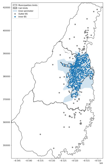 In order to estimate the distance travelled both within the city and in its surrounding rural districts, we divide the base station network into two large subareas. As the tessellation defined by the Voronoi’s polygons of the BS network does not match the administrative boundaries of the city, we associate to the inner city of Cali all the base stations’ antennas located within a buffer of 700 metres outside of its administrative border. Note that since these base stations have variable spatial coverage, the resulting area boundary may be irregularly distant from the administrative city limits, as can be seen in Figure 5. Thereafter, we will call the inner region and the outer area.