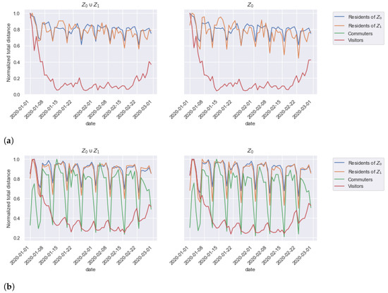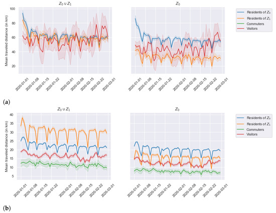 Lastly, the comparative analysis of Figure 14a,b illustrates the impact of the completeness filter on sample sizes and statistical representativity both for commuter and visitor categories, as Figure 14a displays high variability and large confidence intervals. Daily visitors may present similar presence patterns to commuters and suffer from the too-high 0.6 completeness threshold.