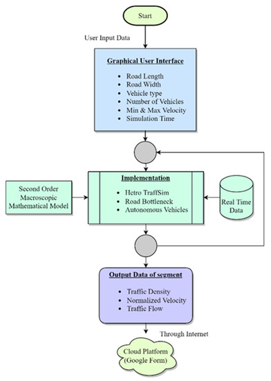 This section presents HetroTraffSim, a simulator for heterogeneous traffic flow at road bottlenecks. It was developed using the Unity3D engine and the C# language. This engine was chosen because it offers a fast, efficient, and realistic simulation development environment. It provides cross-platform functionality enabling developers to build software for different platforms such as Android, iPhone, and Windows. The HetroTraffSim framework flow diagram is shown in Figure 1. The GUI allows users to input traffic parameters such as road length and width, bottleneck length, density, number and types of vehicles, minimum and maximum velocity, and simulation time. HetroTraffSim simulates traffic flow using a second-order macroscopic traffic flow model and real roadside traffic data. Traffic parameters such as flow, density, and velocity are provided for analysis and stored in the Google cloud. The components of the HetroTraffSim framework are described below.