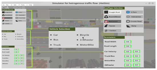 For realistic traffic simulation according to local traffic conditions, HetroTraffSim allows users to select vehicle and road types as shown in Figure 2. The dimensions of vehicles on Pakistan roads available in HetroTraffSim are provided in Table 1 [18]. The maximum velocity for each vehicle type can be set according to real traffic conditions.