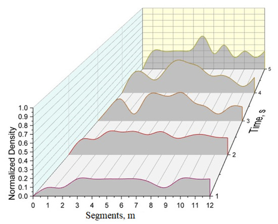 At 3 s, the lowest density is 0.10 in segments 3 and 10 while the highest density is 0.39 in segments 5 and 7. In segments 1, 9, 11, and 12, the density is 0.20. In segment 2, it is 0.29 while in segment 6 it is 0.35. In segment 8, it is 0.26. At 4 s, the density is approximately 0.29 in the first two segments and decreases to 0.20 in segment 3. It increases in segments 4 and 5 to 0.49 and then decreases in segments 6, 7, and 8 to 0.26. It is 0.10 in segment 11 and 0.23 in segment 12. At 5 s, the density is approximately 0.29 in the first four segments. It then increases in segments 5 and 6 to a maximum of 0.54. The density then decreases and is a minimum of 0.2 in segments 9 and 11.