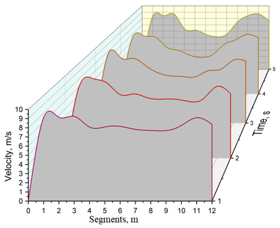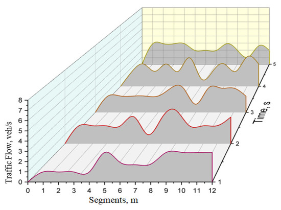 Figure 8 presents the spatial and temporal traffic flow in the road section. At 1 s, the flow is approximately 0.98 veh/s in segments 1 to 4. It rapidly increases to 2.89 veh/s in segment 5, decreases in segments 6–8, and increases again to approximately 2.90 veh/s in segments 9–12. At 2 s, the flow is approximately 1.94 veh/s in segments 1–4 and 9–11. In segment 6, the flow is lowest at 0.99 veh/s, while in segment 8 it is highest at 3.65 veh/s. At 3 s, the flow is approximately 1.95 veh/s in segments 1–5 and 1.90 veh/s in segments 9–12. The largest flow is 2.92 veh/s in segment 7, while the smallest flow is 0.97 veh/s in segment 8. At 4 s, the flow varies in segments 1–5. In segment 5, it is 2.89 veh/s and in segment 3 it is 1.95 veh/s. In segment 7, the flow is lowest at 0.99 veh/s and in segment 11, it is highest at 3.85 veh/s. At 5 s, the flow is approximately 2.90 veh/s in segments 1–4 and 5–7. In segment 8, it is 2.91 veh/s, in segment 11 it is 2.60 veh/s, and it is lowest at 0.99 veh/s in segment 10.