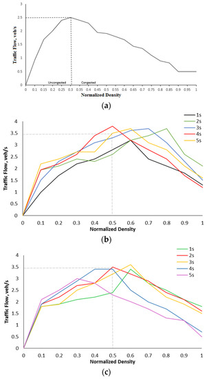 With a 10 m distance headway, at 1 s the maximum flow is 3.0 veh/s at a density of 0.60 as shown in Figure 10c. At 2 s, the maximum flow is 3.6 veh/s at a density of 0.80, and at 3 s the maximum flow is 3.6 veh/s at a density of 0.70. At 4 s, the maximum flow is 3.5 veh/s at a density of 0.50, and at 5 s the maximum flow is 3.7 veh/s at a density of 0.60. Figure 10b,c show that the road capacity differs according to the density. These results provide insight for traffic planners to determine the road capacity based on the density with a given distance headway.