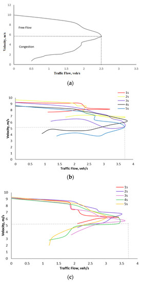 Figure 12a presents the initial velocity versus traffic flow when the data are first recorded in the simulator. The free flow velocity (uncongested traffic velocity) varies between 5.8 m/s and 10 m/s while the congested traffic velocity varies between 0 m/s and 5.8 m/s. The maximum flow is 2.5 veh/s. Figure 12b shows that with a 2 m distance headway, at 1 s the velocity is 8.5 m/s at a maximum flow of 3.3 veh/s. The uncongested velocity varies between 8.5 m/s and 9.5 m/s while the congested velocity varies between 7.5 m/s and 8.5 m/s. At 2 s, the velocity is 7.0 m/s at a maximum flow of 3.7 veh/s. The uncongested velocity varies between 7.0 m/s and 10 m/s while the congested velocity varies between 6.5 m/s and 7.0 m/s. At 3 s, the velocity is 5.5 m/s at a maximum flow of 3.7 veh/s. The congested velocity varies between 3.5 m/s and 5.5 m/s while the uncongested velocity varies between 5.5 m/s and 9.0 m/s. At 4 s, the velocity is 6.0 m/s at a maximum flow of 3.6 veh/s, and at 5 s the velocity is 6.0 m/s at a maximum flow of 3.7 veh/s. The congested velocity varies between 3.5 m/s and 5.2 m/s while the uncongested velocity varies between 5.2 m/s and 8.5 m/s.