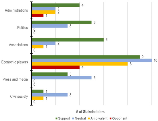 According to Figure 3, stakeholders expected to be ‘ambivalent’ or ‘opposed’ were mainly found in the two categories ‘administration’ and ‘economic players’. Especially in the category of ‘economic players’ the evaluation of the identified stakeholders on regional level showed a potential for conflict due to the high number of ‘ambivalent’ or ‘opposing’ attitudes.