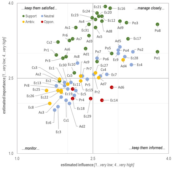 Figure 4 shows the final assessment of all 70 identified stakeholders regarding the two criteria ‘influence’ (horizontal axis) and ‘interest’ (vertical axis) evaluated in the questionnaire by 31 experts from the predefined categories. The designation of the assessed and associated stakeholders can be found accordingly in Table 1. The diagram is divided into four different fields, where the corresponding categorization is made based on the average assessment of the respondents. The individual fields describe how the stakeholders in the respective fields should be involved, informed, and given appropriate attention. In addition, the classification of stakeholders provided important input for the design of a targeted stakeholder participation process. The following characteristics could be assigned to the four fields:
