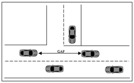 With priority junctions with only two traffic streams, the gaps recognized by motorists on minor roads are evident. As shown in Figure 1, the passing timings of the main road vehicles in the conflict zone may detect gap occurrences. The length between two vehicles determines the duration of a gap. Nevertheless, in most situations, there are generally different traffic streams with varying priorities. Drivers with a lower priority must discover openings in the traffic caused by those with a higher priority. If the major road has several lanes, motorists on the minor road will only encounter gaps between these traffic streams, including the possibility of physical conflict. For instance, a minor road left turn (left-hand traffic) may encounter only right-side traffic gaps, while a minor road right turn (left-hand traffic) needs to consider all gaps between vehicles on the right and left sides [].