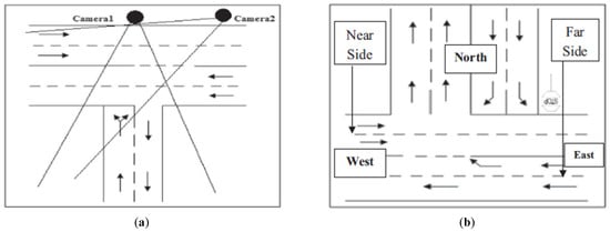 (a) Position of cameras. (b) Traffic lane arrangement at priority junctions.