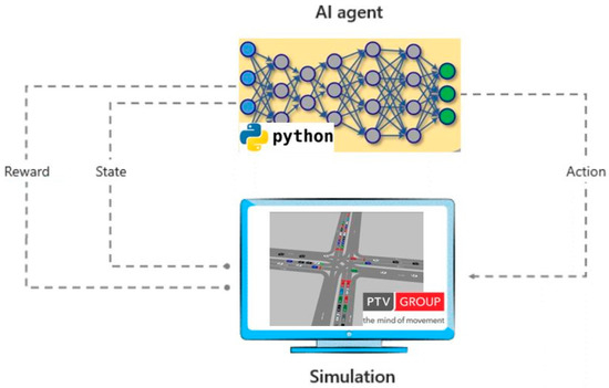 AI training and trial and error processes are usually performed in simulation testbeds, enabling a trained agent to tackle a broad scope of real-world scenarios. In the DQN approach, states are the input layer of the neural network, and the neural network’s output layer is an estimation of Q-values for all possible actions in the current state. The training occurs by updating the neural network weights based on a batch of recent historical data (states, actions, Q-values). In this study, the simulation testbed is developed in VISSIM software, and the DQN is developed as a Python application; a high-level training process of a DQN agent appears in Figure 1.