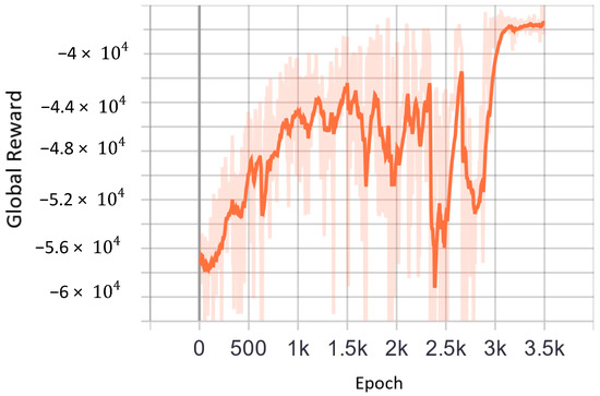 Figure 3 shows that the global reward converges to a maximum value after 3500 training epochs, which means an overall delay reduction for the intersection.