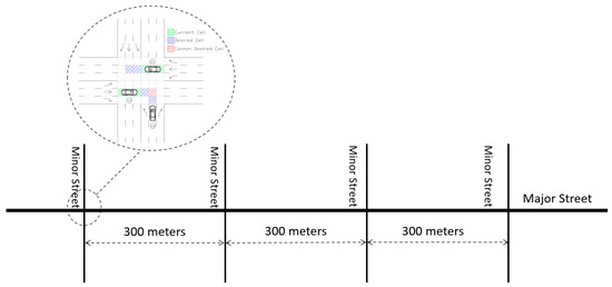 Each leading vehicle’s reward at each time step is the summation of the delay of all vehicles in its direction. Assuming that the distance traveled by the vehicle at the time step t is , then the optimal time required to pass the distance equals ). Each approach’s delay value equals the reward function and is calculated based on Equation (5).