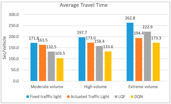 Followed by delay reductions, travel time improvement is also expected. The average travel time values shown in Figure 6, reveal that 22% and 16% travel time reductions are gained compared to the LQF control system in moderate and high volume circumstances, respectively. In the extreme volume regime, the proposed control system outperforms the actuated control system with an 11% travel time reduction.