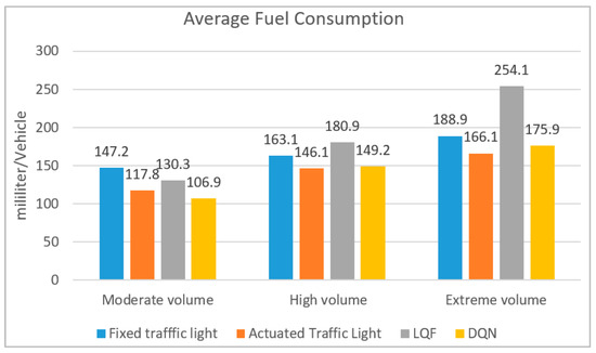 Along with target traffic measures, the environmental and safety impacts of the model are also evaluated. Fuel consumption and CO2 emission are calculated based on the VT-Micro model. This model can estimate the emissions and fuel consumption for individual vehicles based on instantaneous acceleration and speed [22]. The average fuel consumption results appear in Figure 7; the DQN gains a 9% fuel consumption reduction in the moderate volume regime compared to the actuated control system. The actuated traffic light outperforms DQN with 2% and 6% fuel consumption reductions in high and extreme volume regimes, respectively. However, the proposed control system noticeably outperforms the other pixel-reservation-based model (LQF) in all volume regimes.