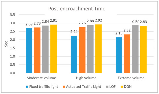 Among various Surrogate Safety Measures, the post-encroachment time (PET) is a well-fitting measure used to identify safety threats for crossing vehicles at an intersection. It represents the time between the departure of the encroaching vehicle from the conflict point and the vehicle’s arrival with the right-of-way at the conflict point [23]. Safety analysis is performed in the SSAM software, automatically identifying, classifying, and evaluating traffic conflicts in the vehicle trajectory data output from microscopic traffic simulation models. The comparison of PET for different traffic control systems appears in Figure 9 According to the figure, pixel-reservation-based logics, including DQN and LQF, have an almost equal PET. Both perform better than the actuated traffic light, specifically in extreme volume regimes with a 22% improvement in PET. Pixel-reservation-based control systems consist of more stop-and-go, which increases the chance of an accident in regular intersections. Therefore, even a minor improvement in PET compared to conventional control systems is noticeable.