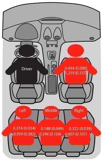 - Evans, L.; Frick, M.C. Seating position in cars and fatality risk. Am. J. Public Health 1988, 78, 1456–1458. [Google Scholar] [CrossRef] [PubMed]