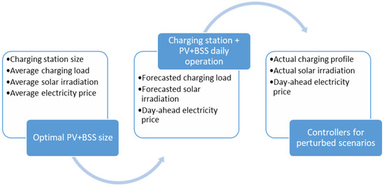 The paper is organized as follows: Section 2 analyses the data relating to the cars’ journeys that end up at the Brescia University parking lot and the management of requests to the charging infrastructure. An evaluation of the cost-effectiveness of the investment is made for a PV source equipped with a BSS. In Section 3, the daily power flows to the station are studied with the aim of optimizing the use of the BSS based on the forecasts of user influx and insolation, according to an economy criterion. The impact of input variability is studied by comparing the performances of two automatic feedback controllers and a real-time power flow management system. Section 4 presents the conclusions. Appendix A presents an insight into the methodology for weather forecasts.