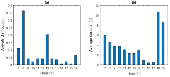From the data set, the records of the journeys ending at the Brescia University car parking are selected. Charging systems for electric vehicles have been installed in the parking area as part of the MoSoRe@Unibs project [24]. The extracted dataset consists of 147 records. Journeys are concentrated on working days, while the number of events over the weekend is scarce (4 arrivals referring to 3 cars). Given the small number of events over the weekend, we focus the analysis on working days. The average number of arrivals registered on weekdays is three cars per day. Figure 3a shows the hourly distribution of the frequency of arrivals. These were gathered from the 7 a.m.–8 a.m. and 1 p.m. time slots, with about 82% of the events occurring within the 1 pm slot. No events are recorded in the 7 p.m.–7 a.m. time slot. Figure 3b shows the average duration of parking events based on the arrival time for working days.