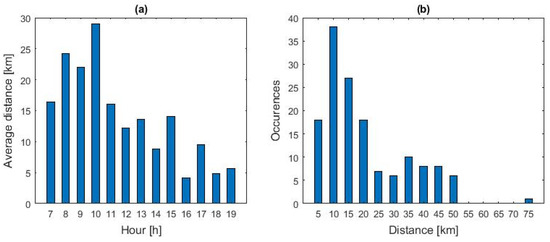 The hourly distribution of the average distances traveled, as reported in Figure 4a, shows that these are generally higher for arrivals occurring in the morning than in the afternoon and evening. The distribution of occurrences by journey distances, as reported in Figure 4b, shows that most journeys are cover short distances. Approximately 69% of the trips are within 20 km, and almost 90% are within 40 km.