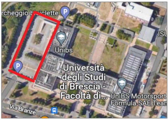 Satellite image of the Faculty of Engineering of the University of Brescia. The red box delimits the parking area.
