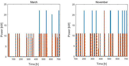 For the charge management, we compare the results for the FIFO and linear optimization approaches, as presented in Section 2.1. For the linear optimization approach, we chose to satisfy the charge requests, even if this leads to a violation of the power limit constraint. Figure 6 shows the results of applying the two approaches for the months analyzed. In particular, the limit value set for the station in approach (b) is 11 kW. With the FIFO approach, the power reaches 22 kW in some cases. If approach (b) is applied, the power always remains below the 11 kW limit, except in a single case in November. The reduction in the above-threshold power used with or without optimization is 89% for the month of November and 100% for March.