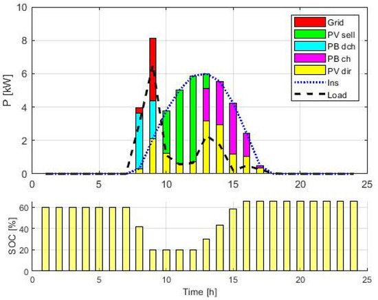 Figure 7 shows an example of power flow optimization, considering a forecast of insolation for one day of March. The red bars represent the purchased contribution from the grid, the yellow bars represent the portion of power produced by the PV used to meet the demand, cyan represents the power discharged from the batteries, and magenta represents the charged power, while green represents the portion of PV energy sold to the network. The black dashed line is the load, and the blue dotted line represents the insolation. The bottom panel shows the battery state of charge (SOC). In the simulation, the efficiency of the grid converter, the load inverter, and the photovoltaic panels was set equal to 0.9, while for the battery, it was assumed to be 0.85 in charge and discharge.