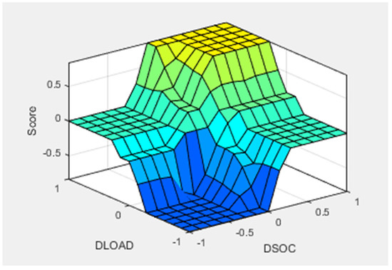Rule surface for the fuzzy model that controls the change in demand. Input: ‘DLOAD’; ‘DSOC’. Output: ‘Score’.