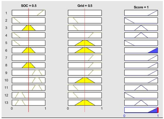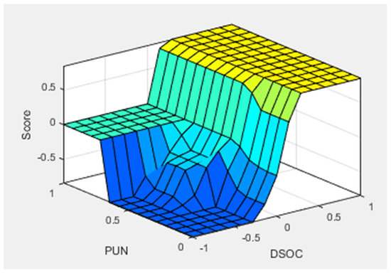 Figure 9 shows the surface of the rules for the model that regulates charges from the grid. In addition to the deviation of the SOC, ‘DSOC’, defined as in the previous case, the other input is the value of the price of electricity, ‘PUN’, normalized between 0 (minimum) and 1 (maximum). The output ‘Score’ is defined as in the previous case.