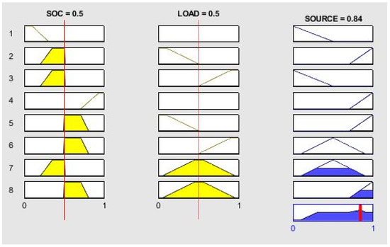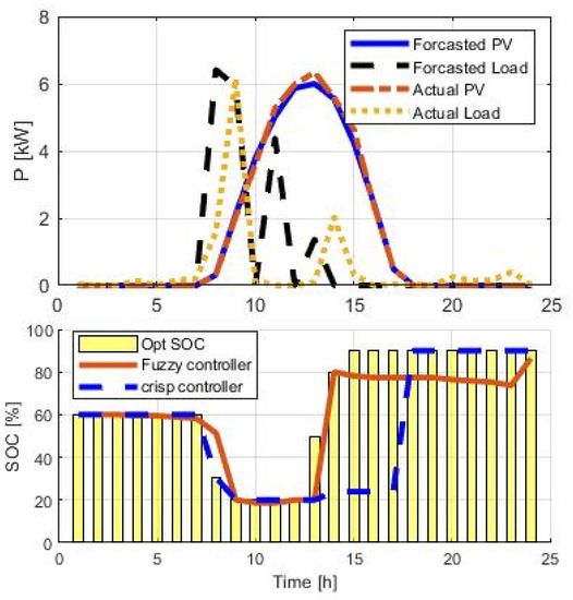 We apply the controller to the battery SOC. We consider the optimal profile for the SOC, obtained based on forecasts of power demand, sunshine, and electricity price for the next day, as illustrated in the previous section. We, therefore, perturb demand and PV production. The controller tries to maintain or restore the SOC to the expected level, implementing the appropriate operational policies that account for the variation in demand, the price of electricity, and the deviation from the expected SOC value. The approach has been implemented in MatLab®, using the Fuzzy Logic Toolbox [41].