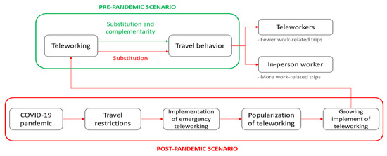For decades, the effect of teleworking on travel behavior could not be properly acknowledged, especially in terms of its possible influence on reducing travel. As this practice was not very popular, especially in Brazil, investigating its relationship with mobility was not conclusive [26,27,28]. Currently, due to the pandemic, the popularization of its practice enabled a more in-depth investigation. As a matter of fact, the decrease in the number of trips was due to the pandemic and not necessarily to telecommuting. Considering the persistence of the practice of teleworking and teleactivities in post-pandemic scenarios, the investigations can be more comprehensive. Therefore, this paper presents data from two very different contexts: (1) the first year of the pandemic—2020; (2) and a period of “return” to normalcy characterized by a greater relaxation of social isolation—2022. Figure 1 illustrates the relationship between teleworking and mobility and the influence of the pandemic on the formation of new individual travel habits.