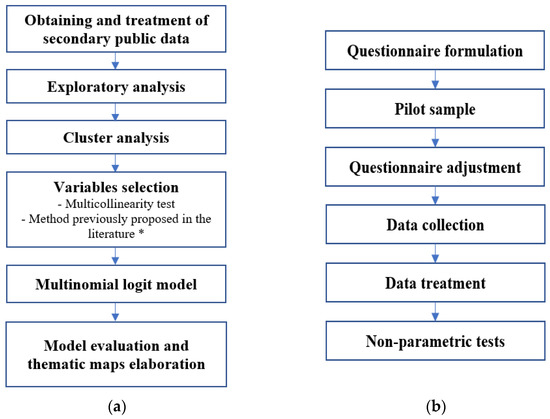 The methodological procedure was divided into two sets of sequential steps as the present article is based on two different approaches at different times of the COVID-19 pandemic. The first one (Figure 2a) analyzes the public data presented in Section 3.1.1, and the second approach (Figure 2b) analyzes the data from the primary data collection described in Section 3.1.2.