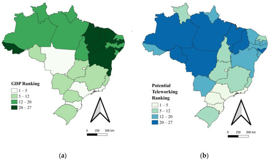 Ranking of the Brazilian states according to the GDP (a) and potential teleworking (b).