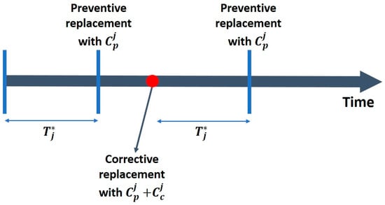 The components of the system are clustered into g groups. For each cluster Cj (with j ∈ {1, g}), a Weibull analysis using the EM algorithm presented in the previous section is applied to identify the parameters (αj, βj). The policy suggested in this section is an age-based replacement for each cluster Cj. As illustrated in Figure 2, the preventive replacement of cluster Cj is carried out once the age of the component reaches a critical operational age Tj∗ (Tj∗ being the optimal replacement age of all components in cluster j). If the component fails between two replacement dates, the component is replaced, and the maintenance action cost is Ccj. To avoid over-maintenance, the age of the component is initialized at 0 after a corrective action and the preventive action scheduling is translated from the date of the failure.