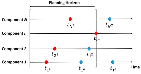 where defines the first maintenance action for component i. To illustrate this method, an example is presented in Figure 3. In this example, HZ = HZ = [0, ]. In this planning horizon, components 1 and 2 are maintained twice and component N is maintained only once.