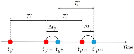 Penalty cost: Let tij be the time of the jth maintenance action for component i. When the maintenance actions are grouped, the maintenance execution time of the grouped maintenance actions is changed to . The difference between the initial time and is denoted ∆tij. Figure 4 introduces an example of the changing execution time process. Initially, the actions j, j + 1, and j + 2 of component i were all Ti* apart. Since action j + 1 was grouped at time which is ∆tij later, action j + 2 had also to be delayed by ∆tij. Thus, such changes involve a penalty cost, denoted ∆HG1k, because either the service life of component i is reduced or the likelihood of failure increases (with respect to the sign of ∆tij).