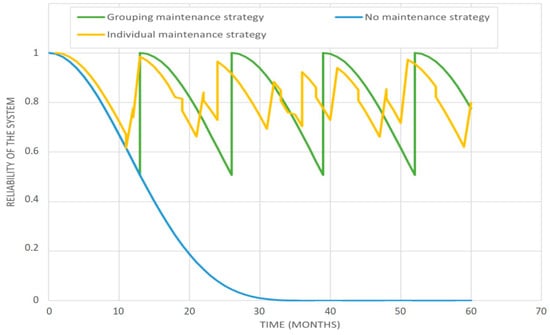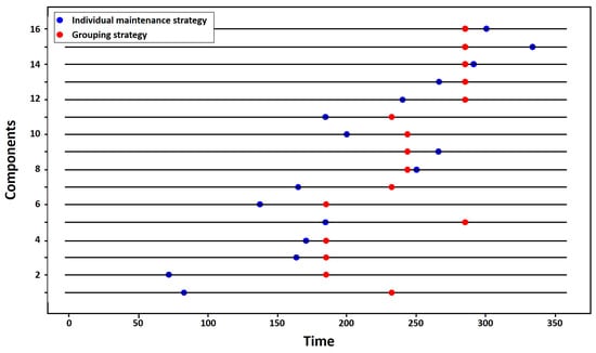 In industry, grouping maintenance is a way to minimize preventive maintenance costs. The aim of the method is to identify the optimal time to simultaneously maintain a complex system’s components. According to [], the dependencies between the system’s components are classified into stochastic, structural, and economic. Many grouped maintenance policies are presented, and most consider only economic dependence.